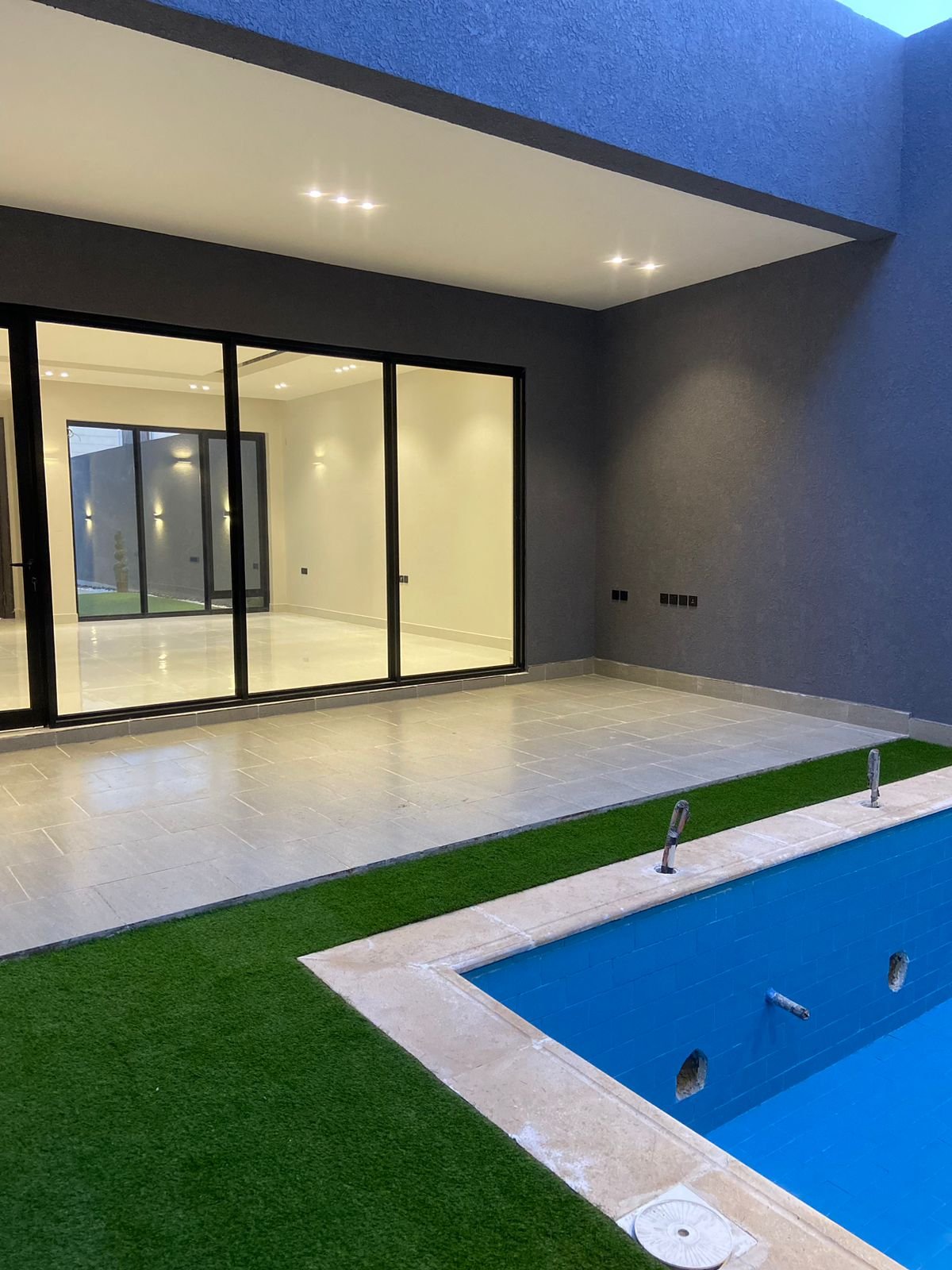 مدخل سيارة+ غرفة سائق+ ملحق في المقدمة وملحق في الخلف +مدخل رجال ونساء + جلسة خارجية مع فناء جانبي+ مسبح+ مجلس + صالة طعام + صالة + مطبخ مع غرفة خادمة + غرفه غسيل + درج داخلي مصعد(راكب).