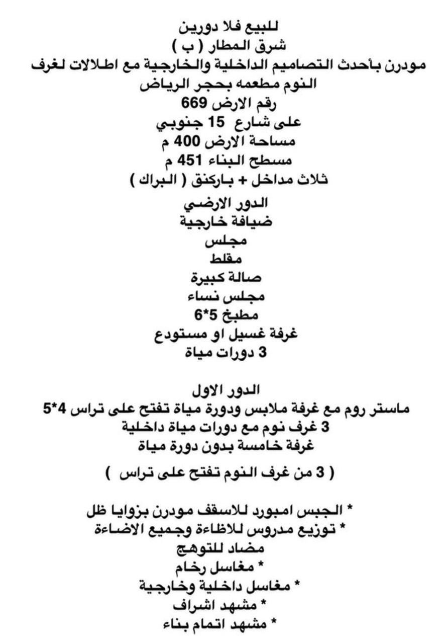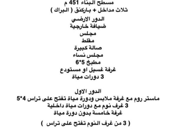 الدور الارضي ضيافه خارجيه مجلس مقلط صاله كبيره مجلس نساء مطبخ غرفه غسيل او مستودع 3دورات مياه